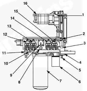 1加注旁通閥(內(nèi)部),2 320-psi 壓力調(diào)節(jié)器,3 36-mc 濾清器濾網(wǎng),4燃油進口管接頭/進口濾清器殼,5快斷壓力鎖片 — 吸入側(cè),6燃油加注泵,7燃油濾清器,8 250-psi 壓力調(diào)節(jié)器,9燃油切斷閥,10快斷壓力鎖片 — 壓力側(cè),11燃油壓力傳感器,12前油軌執(zhí)行器,13前正時執(zhí)行器,14后正時執(zhí)行器,15后油軌執(zhí)行器,16燃油泵總成。