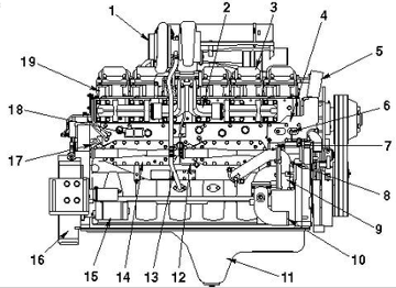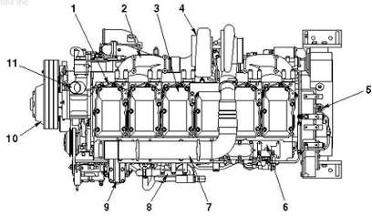 1冷卻液排氣管,2排氣歧管,3搖臂室蓋,4渦輪增壓器,5發(fā)動機轉(zhuǎn)速傳感器(僅限于工業(yè)用發(fā)動機),6進氣歧管,7空-空中冷器管路(渦輪增壓器到空-空中冷器),8燃油濾清器座,9冷卻液濾清器座(僅限于工業(yè)用發(fā)動機),10風扇轂總成,11發(fā)動機冷卻液出口,
