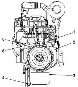 1機油壓力檢查點(后機油冷卻器),2飛輪殼,3油底殼,4發(fā)動機機油排放閥,5發(fā)動機轉(zhuǎn)速傳感器(僅限于工業(yè)用發(fā)動機),6 OEM 電氣接頭(僅限于工業(yè)用發(fā)動機),