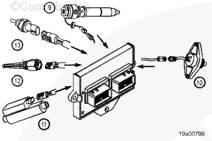 康明斯機油壓力傳感器向 ECM 發(fā)送信號,用于發(fā)動機保護系統(tǒng)。該傳感器位于發(fā)動機缸體上。參見第 E 節(jié),了解部件位置的詳細信息。