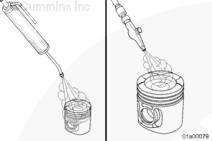 不要使用金屬刷。金屬刷會損壞活塞環(huán)槽。不要用玻璃噴丸清潔活塞環(huán)槽??墒褂昧慵枮?822735的胡桃殼或塑料噴丸對活塞環(huán)槽和活塞頂進行噴丸處理。用最小的有效壓力,并且不要長時間集中噴射一個區(qū)域。塑料噴丸的推薦工作壓力是276 kPa [40 psi]。