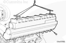 使用一部吊車、兩個 10-mm T 形手柄和一根吊索。連接 T 形手柄、吊索和吊車。升起吊車直至吊索張緊。拆下其余的螺栓和中冷器總成。拆卸并廢棄密封墊。