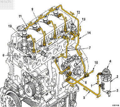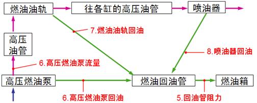 1、由油箱供油, 2、燃油濾清器,3、油水分離器放水口,4、手油泵,5、至燃油泵的燃油供應(yīng),6、高壓燃油泵,7、至高壓油軌的燃油供應(yīng),8、燃油油軌,9、向噴油器供油的高壓油管,10、噴油器,11、噴油器回油,12、高壓減壓閥,13、高壓減壓閥回油,14、燃油回油管,15、燃油返回油箱,