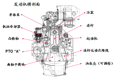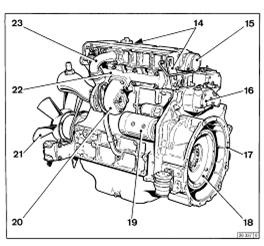 14 升降點,15曲軸箱呼吸閥,16 調(diào)速器,17 SAE護蓋,18調(diào)速輪,19 啟動馬達(dá),20 廢氣渦輪增壓器,21鼓風(fēng)機,22 排氣總管,23進氣口總管,