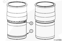 通過康明斯ISX15 CM2250發(fā)動(dòng)機(jī)缸套下部外徑上加工出的條帶 (1) 可以輕易識(shí)別出工廠墊片調(diào)整缸套。安裝缸套后,同樣可以看到此條帶。這些缸套在中間限位座合區(qū)域還包含有固定式硬化黃銅墊片 (2)。