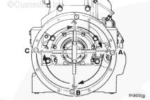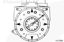 緩慢轉(zhuǎn)動康明斯ISX15 CM2250發(fā)動機(jī)曲軸。記錄在 9 點、12 點和 3 點位置時的讀數(shù),并作為 (a)、(b) 和 (c) 記入同心度工作表。6 點鐘位置重新檢查零位。