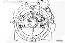 出廠時康明斯ISX15 CM2250發(fā)動機(jī)飛輪殼通過兩個環(huán)形定位銷固定在缸體上。如果飛輪殼被拆卸,可在環(huán)形定位銷就位的情況下進(jìn)行重新安裝,但必須根據(jù)下列對準(zhǔn)步驟檢查對準(zhǔn)情況。