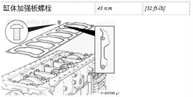注: 對于有些油底殼/吸油管的配置,其中有一個缸體加強板的安裝螺栓與其余螺栓不同。這個有低螺栓頭的的螺栓應(yīng)安裝在與吸油管安裝位置相鄰的開口處。有些應(yīng)用中使用低螺栓頭的螺栓可確保吸油管和缸體加強板安裝螺栓之間有足夠的間隙。