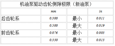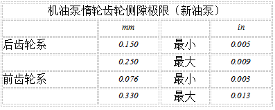 注: 對于后齒輪系發(fā)動機和前齒輪系發(fā)動機,機油泵驅(qū)動齒輪側(cè)隙極限值不同。后齒輪系發(fā)動機采用一個帶有直交齒輪的機油泵,而前齒輪系發(fā)動機采用一個帶有斜交齒輪的機油泵。