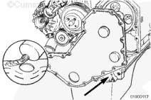 注: 安裝三個導(dǎo)向銷(零件號 3164977)以改進(jìn)前蓋和前油封與齒輪室和曲軸的對準(zhǔn)情況。
