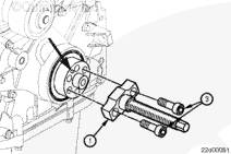 將拆裝器螺釘總成 (1) 安裝在曲軸前端。