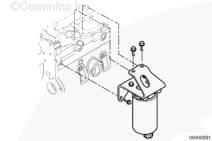 在康明斯發(fā)動機上安裝燃油濾清器座支架。在缸蓋上用手擰緊兩個 M10 螺栓,在缸體中用手擰緊剩余 M8 螺栓。