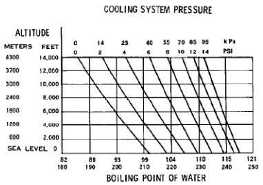 沸點(diǎn)受三種因素影響:壓力,海拔和冷卻液中的乙二醇濃度。液體沸點(diǎn)隨著壓力增加而增加。液體沸點(diǎn)隨著海拔高度增加而降低。圖39顯示壓力和海拔對(duì)水的沸點(diǎn)的影響。