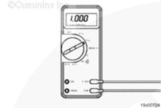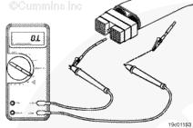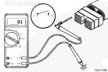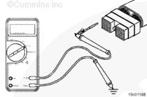 調(diào)整萬用表以便測量電阻。然后將一根測試導(dǎo)線插入 OEM 線束接頭的離合器踏板位置開關(guān)信號觸針。將另一根測試導(dǎo)線插入康明斯離合器踏板位置開關(guān)回路觸針。將鱷魚夾與萬用表表筆相連。