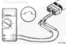 從康明斯離合器踏板位置開關(guān)接頭中拆下一個萬用表表筆,并使該表筆與底盤接地接觸。離合器踏板釋放時,萬用表必須顯示開路特征(100 千歐或更大)。如果電路閉合,更換離合器踏板位置開關(guān)。