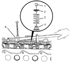 a.將工具(A)安裝在Perkins1106A/C發(fā)動機缸蓋的相應(yīng)位置中,以壓縮相應(yīng)氣缸的Perkins1106A/C發(fā)動機氣門彈簧(3)。