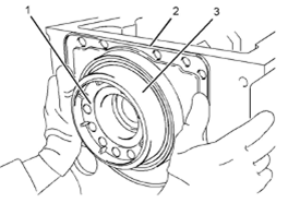 4.對齊塑料套管(3)與Perkins1106A/C發(fā)動(dòng)機(jī)曲軸法蘭(1)。確保塑料套管在Perkins1106A/C發(fā)動(dòng)機(jī)曲軸法蘭上嚙合。將新Perkins1106A/C發(fā)動(dòng)機(jī)曲軸后油封(2)的四角推到Perkins1106A/C發(fā)動(dòng)機(jī)曲軸法蘭上。在這個(gè)操作過程中,會把塑料套管壓出Perkins1106A/C發(fā)動(dòng)機(jī)曲軸后油封。棄置塑料套管。
