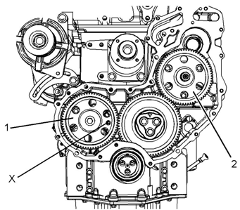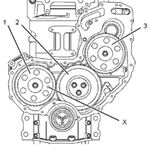 4將工具(B)穿過Perkins1106A/C發(fā)動機(jī)凸輪軸齒輪(1)的孔(X)安裝到前Perkins1106A/C發(fā)動機(jī)機(jī)殼體中。使用工具(B)將Perkins1106A/C發(fā)動機(jī)凸輪軸鎖定到位。