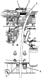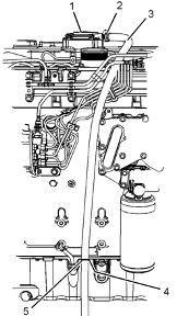 6將軟管(3)連接到Perkins1106A/C發(fā)動機氣門機構(gòu)蓋(1)和Perkins1106A/C發(fā)動機曲軸箱呼吸器的濾清器座(5)上。
