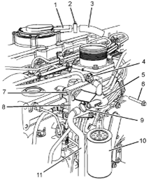 4將軟管組件(11)連接到Perkins1106A/C發(fā)動機曲軸箱呼吸器的濾清器座(5)上。