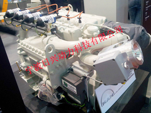 德國曼MAN工業(yè)重型發(fā)動機(jī)、四沖程、直接噴射、水冷、廢氣渦輪增壓及中間冷卻。