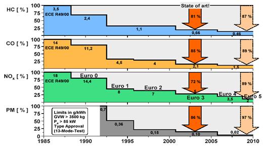 2 、為滿足排放法規(guī)所采用的技術 歐洲1號和2號標準:使用機械控制噴油系統(tǒng)即可達標。歐洲3號標準:必須使用電子控制噴油系統(tǒng)。共軌式系統(tǒng)、電控單體泵,電控泵噴嘴系統(tǒng),蓄壓增壓電噴系統(tǒng)(HEUI)和直列泵分配泵電控系統(tǒng)能夠滿足這個標準。