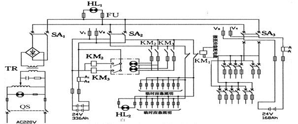 在每一個充電回路應(yīng)設(shè)有防止逆流的逆電流繼電器或二極管,當(dāng)主應(yīng)急電網(wǎng)都失電時,接觸器ZC1線圈失電,常閉觸頭閉合,直接向小應(yīng)急用電設(shè)備供電,其余用電設(shè)備分別利用開關(guān)送電。