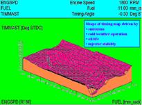 發(fā)動(dòng)機(jī)的ECM內(nèi)有多個(gè)三維圖譜. 如圖所示,當(dāng)各個(gè)輸入信號(hào)的參數(shù)值確定后,在這種工況下的發(fā)動(dòng)機(jī)的正時(shí)也就確定了.