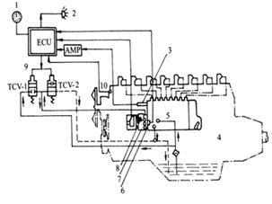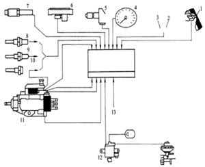 1 – 轉(zhuǎn)速表 2 – 故障指示燈 3 – 供油齒條位置傳感器 4 – 柴油機 5 – 噴油泵 6 – 正時傳感器 7 – 正時控制閥 8 – 轉(zhuǎn)速傳感器 9 – 正時控制電磁閥 10 – 冷卻液溫度傳感器
